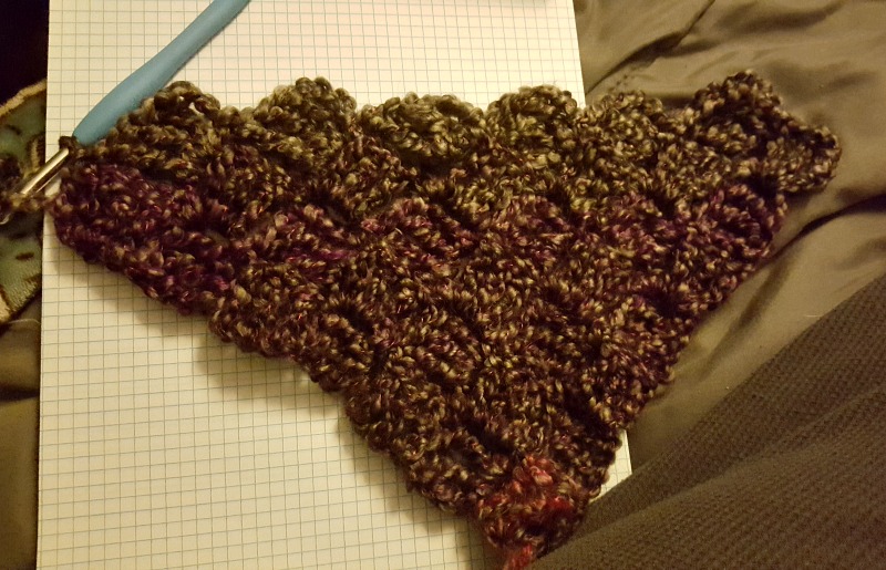 I’m using Lion Brand Homespun in Gemstone Stripes & a I-9{5.5 mm} hook for the main heart body.  I really love the gradient purples & pinks with the gray!  This was leftover from a hat I made my step-daughter for Christmas, which I mentioned in my year end roundup.  I had no picture of the hat then, but now I do & I’ll share it at the bottom!